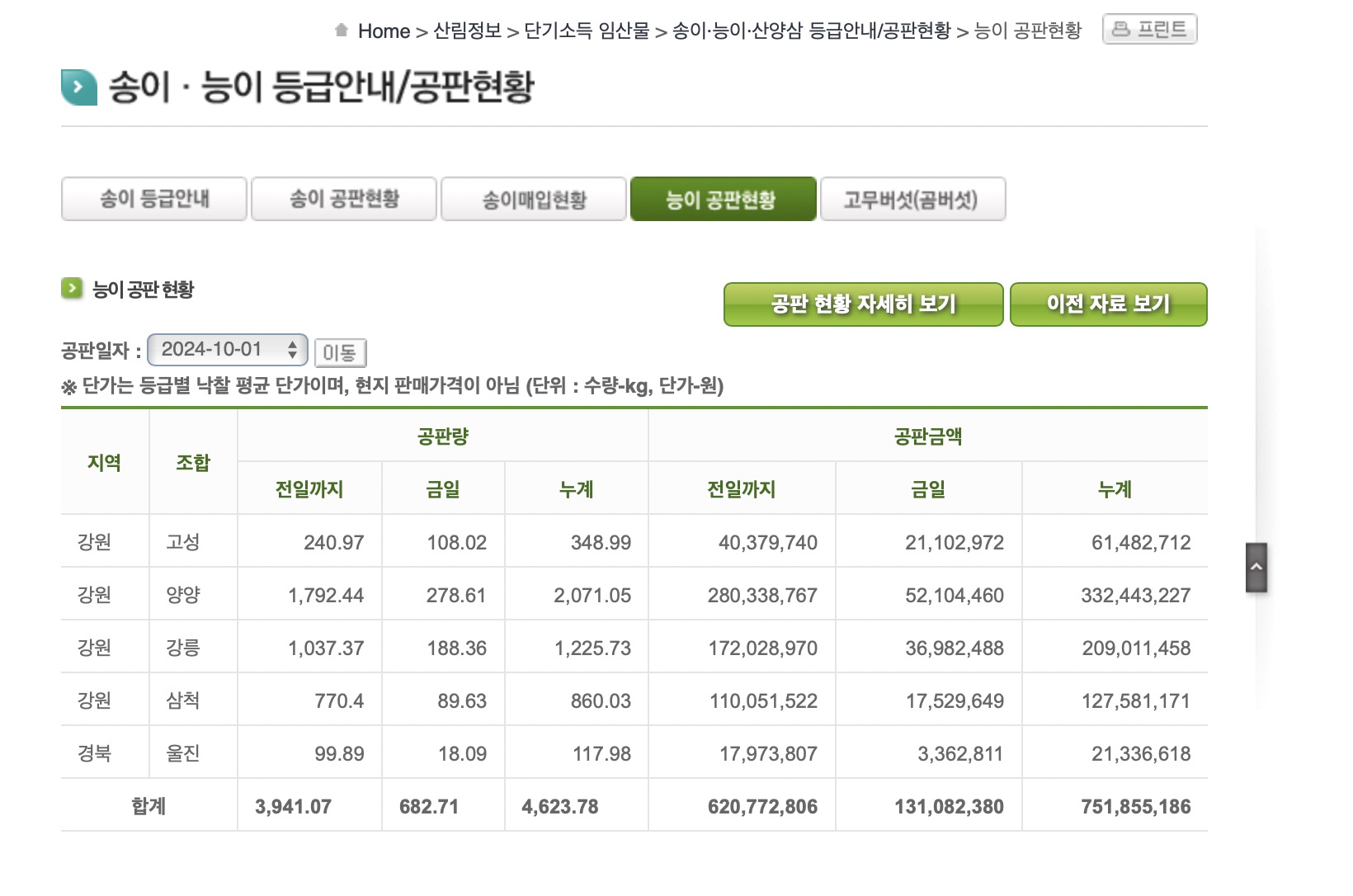 송이 공판 현황 송이 공판 현황 지역 조합 공판량/공판금액 1등품 2등품 3등(생장정지품) 3등(개산품) 등외품 혼합품 최종변경일시 전일까지 금일 누계 수량/단가 수량/단가 수량/단가 수량/단가